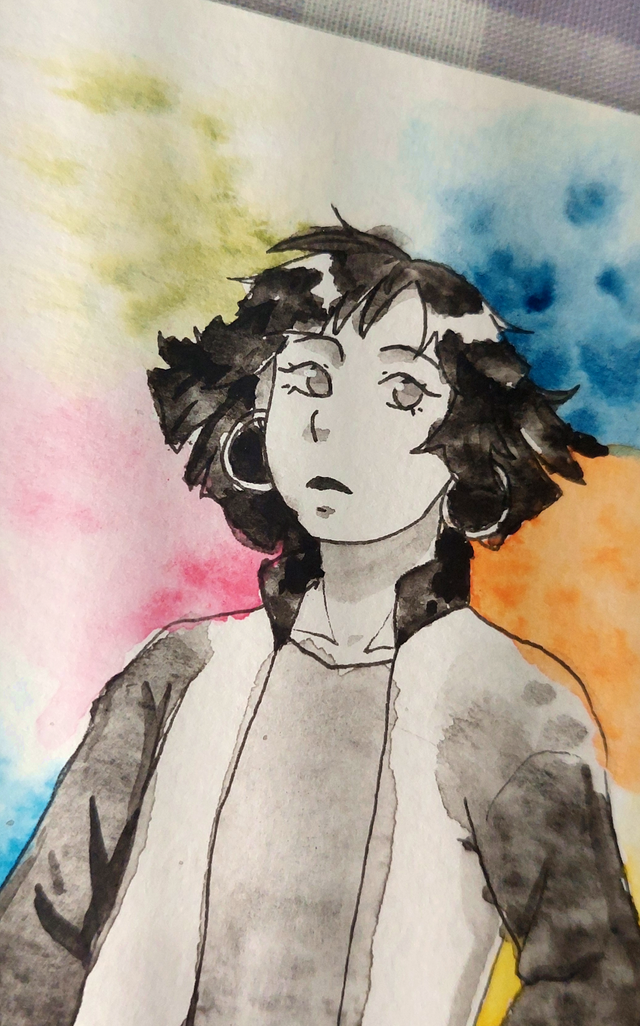Aquarelle originale d'une personnage en noir et blanc sur un fond plein de couleurs.