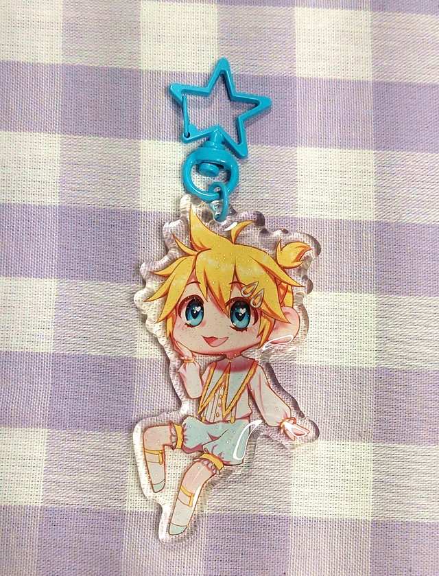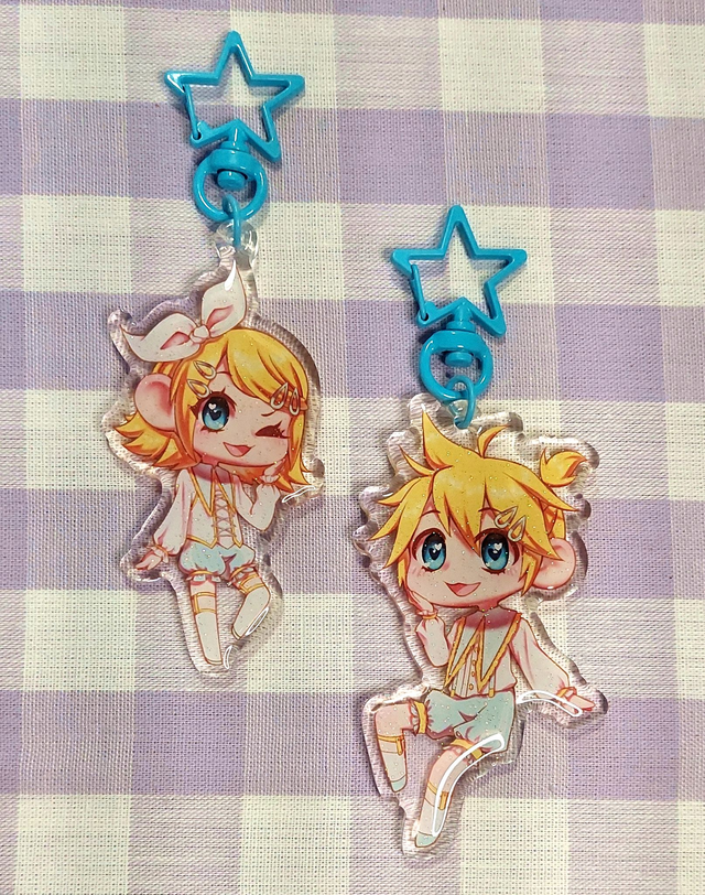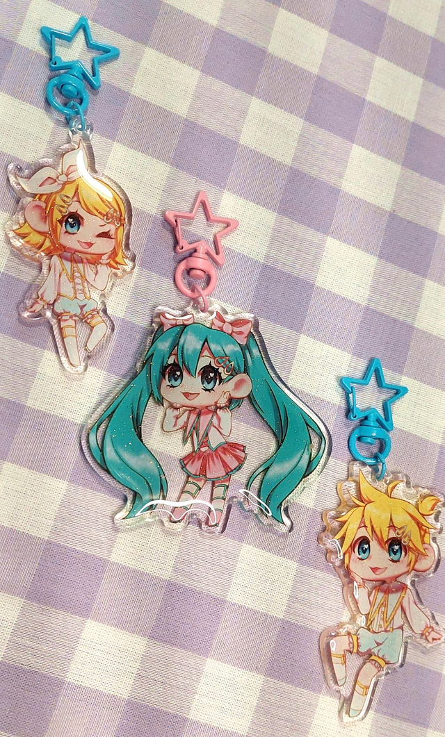 Porte clé à l'effigie des chanteurs principaux de Vocaloid : Hatsune Miku, Kagamine Rin et Kagamine Len dans des tenues délicates aux couleurs pastel. De quoi décorer vos clés avec de jolies couleurs !