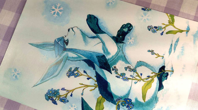 Reproductions d'aquarelle sur le thème des Eeveelutions représentés avec des fleurs, ici Givrali avec des Myosotis. Parfait pour les fans de pokemon, d'aquarelle et de botanique.